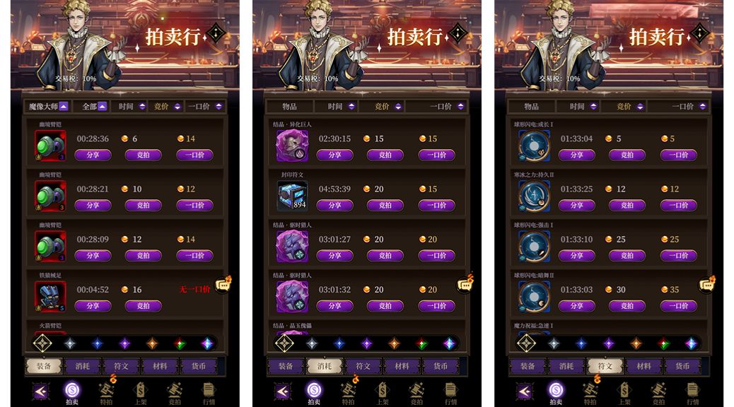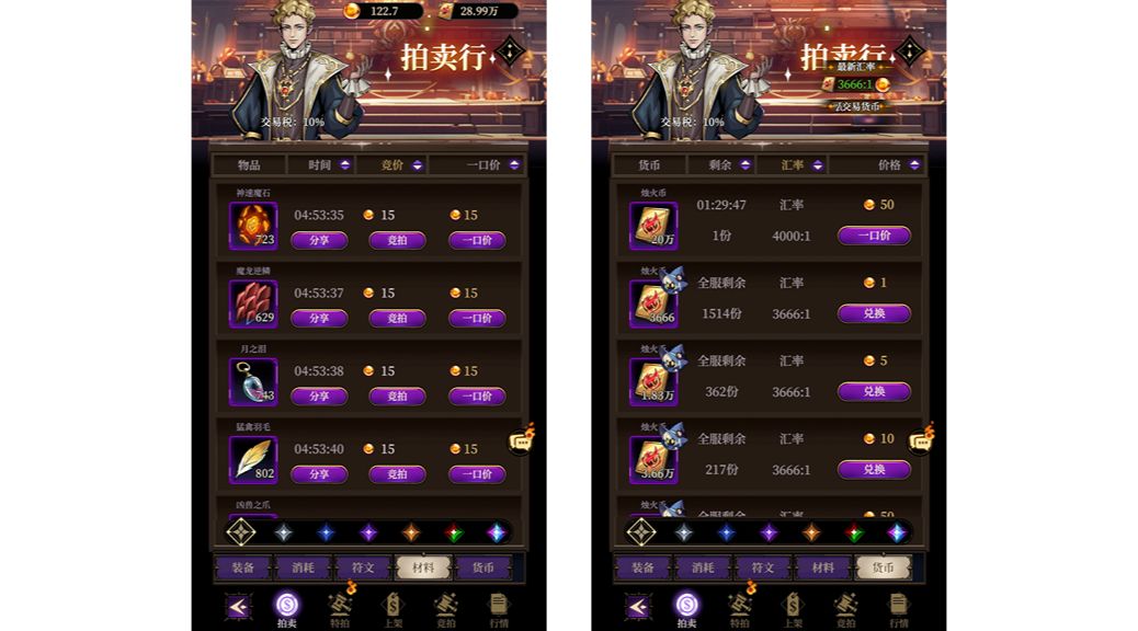 🔹玩家可在拍卖行使用烛火币或起源石购买装备、各类消耗道具(如:封印符文,化身,化身宝箱,圣树根茎,药剂,法术领悟券等)、各品阶符文、各类升级锻造等材料以及购买所需货币;