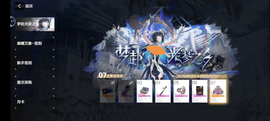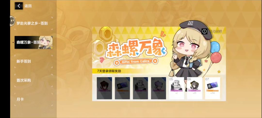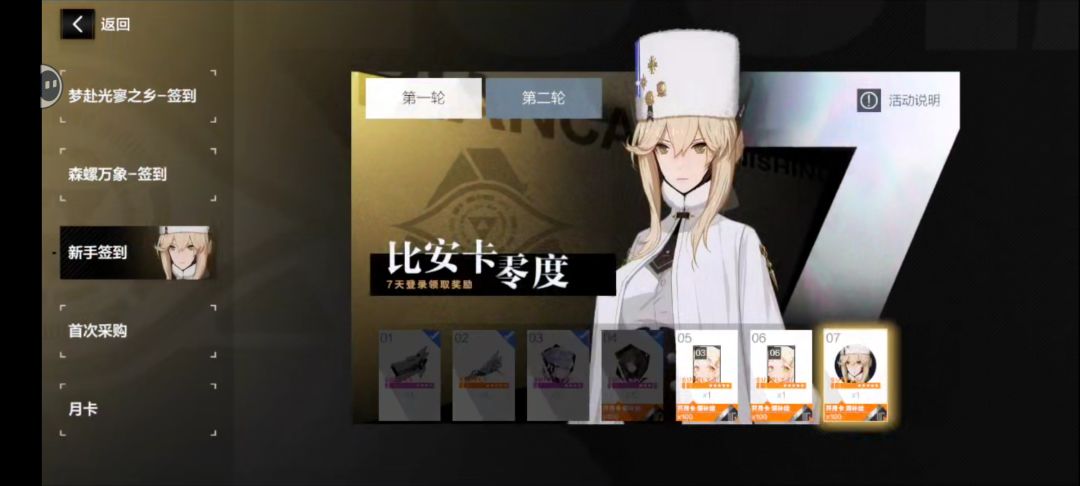 新手签到,这个无时间限制,签到十四天时间,领取角色比安卡零度,虽然没用但不用白不用