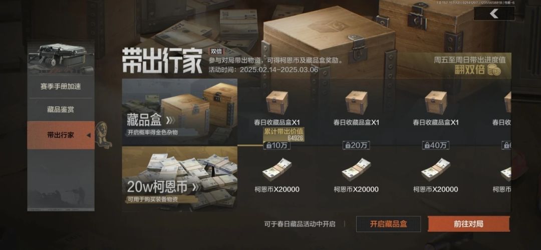 活动期间,参与对局累计带出价值进度,可得至多20万柯恩币及藏品盒奖励!