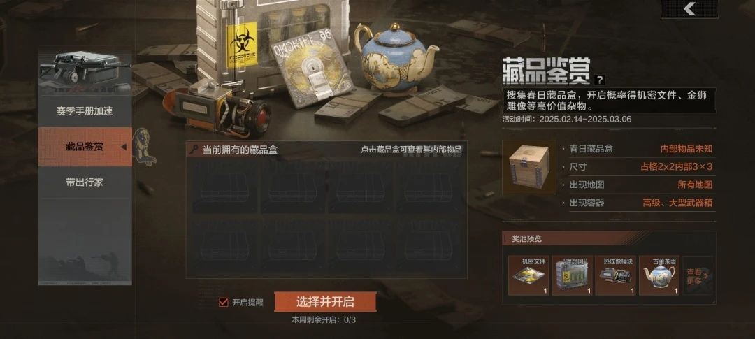 对局内可查看藏品盒内物品的剪影,带出于活动内开启藏品盒,有概率获得机密文件、热成像模块、金狮雕像、古董茶壶等高价值物品。