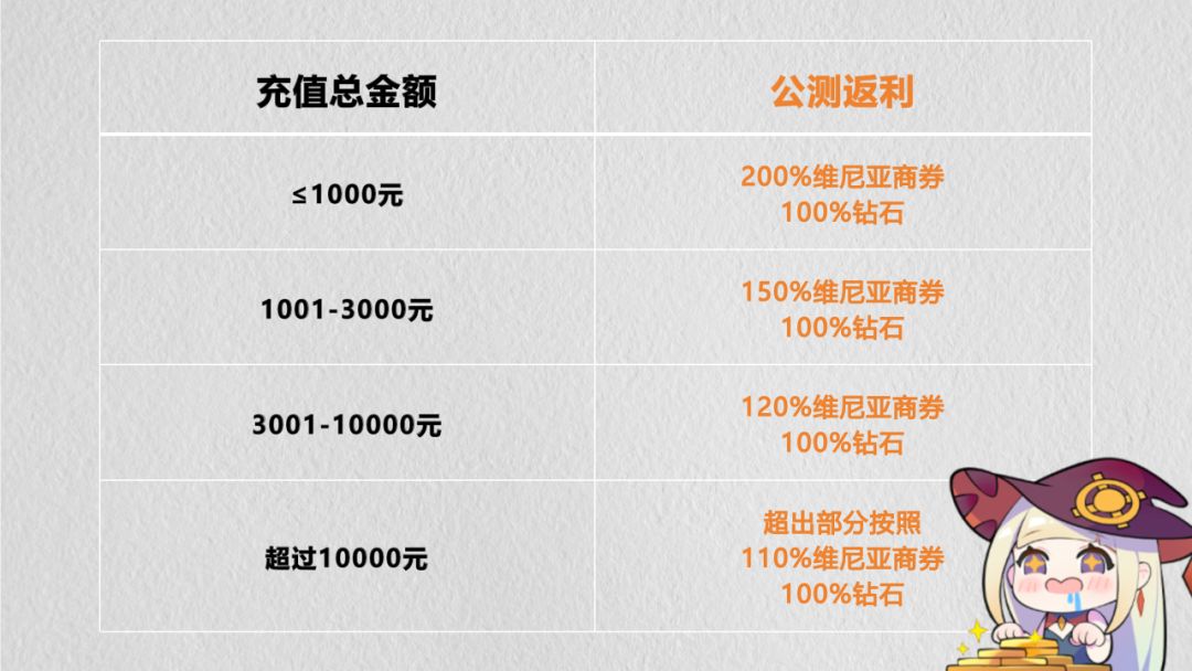 例如,如果您在测试期间累计充值了12000元,游戏正式上线后将会获得(1000x200%)+(2000x150%)+(7000x120%)+(2000x110%)= 15600 的维尼亚商券,和(12000*10*100%)=120000的钻石