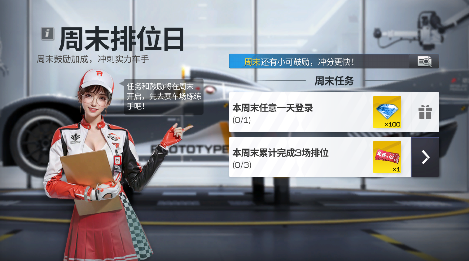 25S2“周末排位日”活动全新升级,时间加倍延长,覆盖整个“热力对决”赛季。每逢周末完成登录和排位任务,即可领取钻石和免费十连抽等奖励,还能领取小可的周末祝福,获取排位加成。这波“弯道超车”“黑马逆袭”的绝佳机会,车手们可千万不能错过了!
