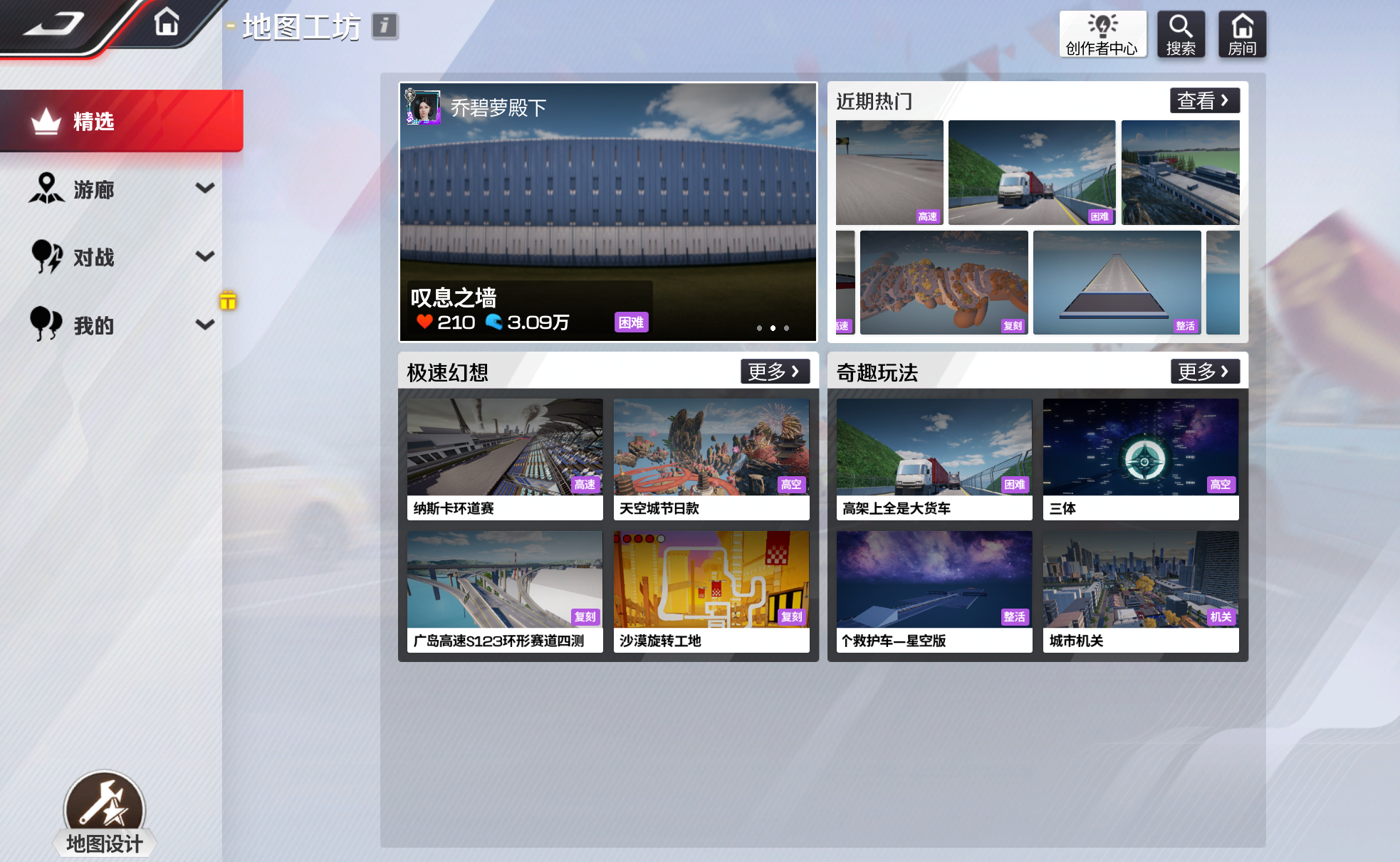除了排位场上的争锋对决,各位“赛车制作人”还能另辟蹊径,利用系统玩法“地图工坊”打造独一无二的地图,为自己的爱车创造专属舞台吸引更多“路人缘”!