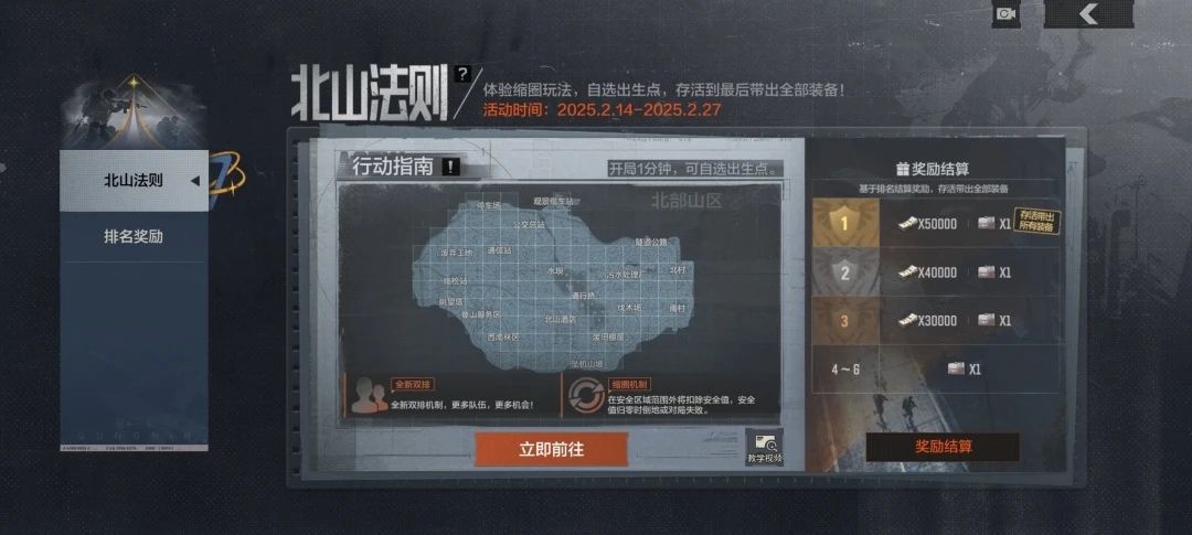 2月14日-2月27日,北山法则限时开放,坚持到最后,即可带出全部装备,收获满满战利品,快来加入这场紧张刺激的挑战吧!