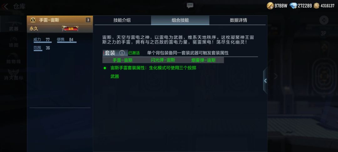 凑齐手雷-宙斯、闪光弹-宙斯和烟雾弹-宙斯,还可解锁宙斯手雷套装属性,在生化模式可使用三个投掷武器,这个专属技能真的很不错,能够让我们在生化模式更好的利用投掷武器来躲避幽灵的追击。
