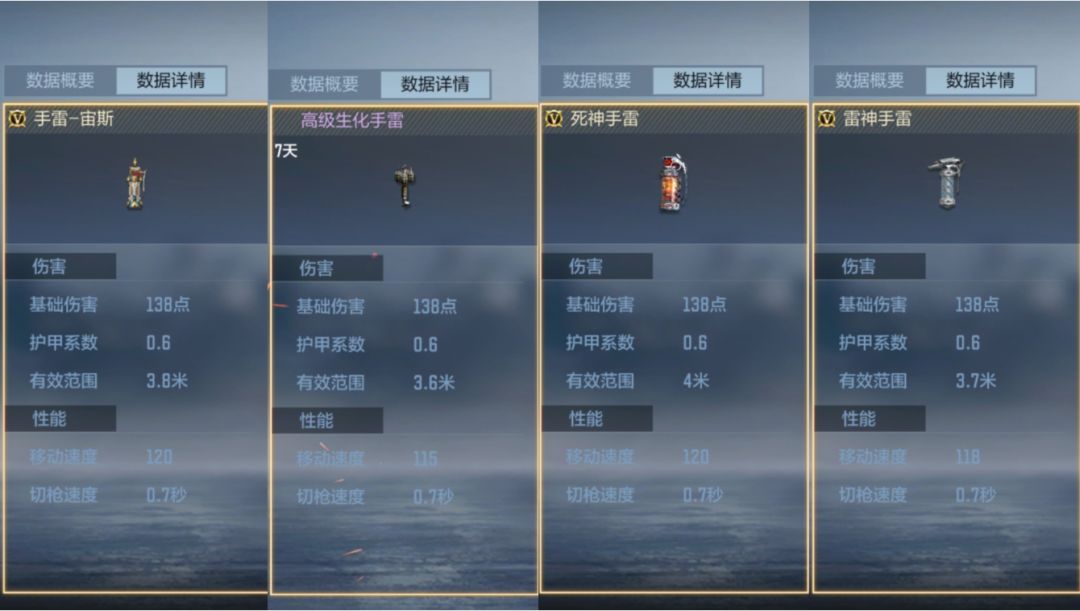 这里用了三款英雄级手雷做对比,可以看到手雷-宙斯有着138超高基础伤害,而且有效爆炸范围要比高级生化手雷和雷神手雷高,仅仅比死神手雷低一点,如果玩家想要在实战中造成较高的伤害,还是要有精准的投掷技巧。