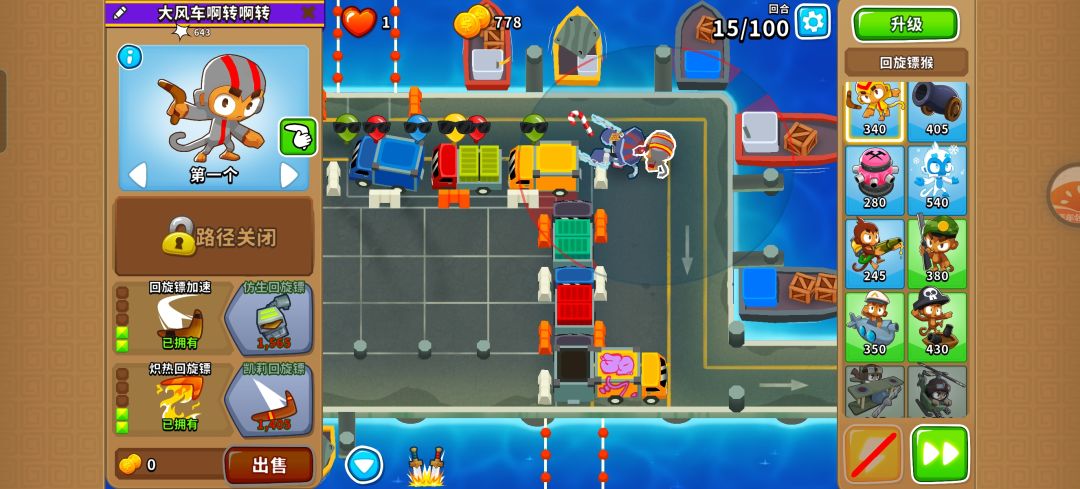 2,在旧回旋镖正下方放新回旋镖,担心放不准可以用刺钉塔定位,然后升到402