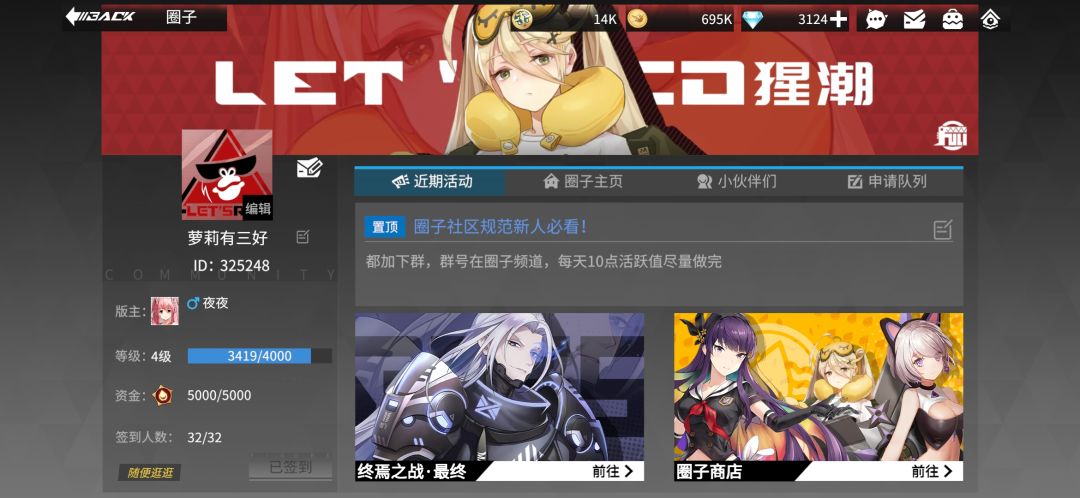 id325248,可以跨服加圈,有群,很活跃,大半百万战力以上了,要求推图18圈以上,每天圈子10点活跃值能做完,圈子玩法估计快来了,大佬们来抱团呀,明天5级圈子了,要来的直接加群1015297483