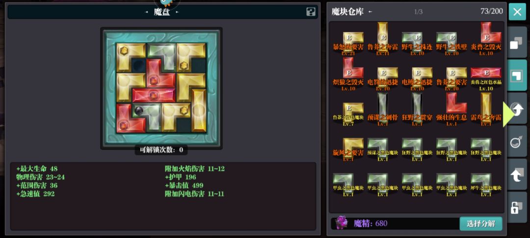这个魔盘可以自己进行合理的调整,攻速够的也可以用连续进攻加致命一击等等。看目前自己属性进行合理搭配。黑色最好是范围伤害和护甲穿透,黄色最好是暴击和极速(看情况选择),红色最好是物理伤害。