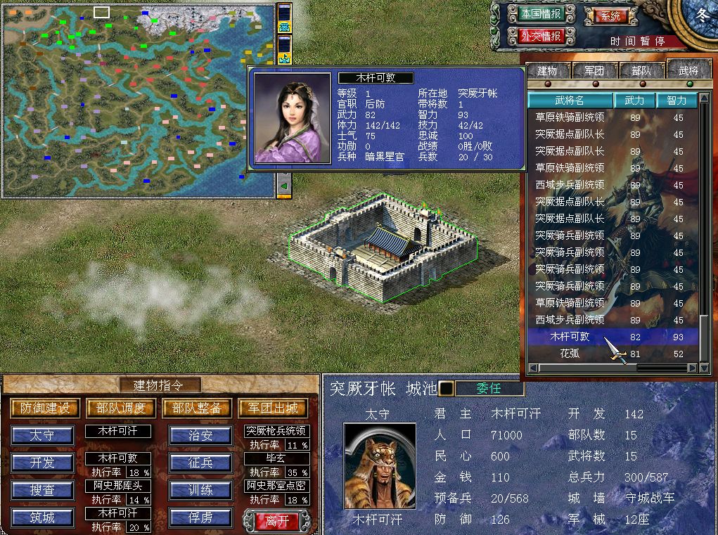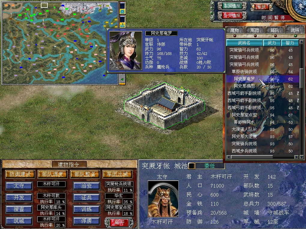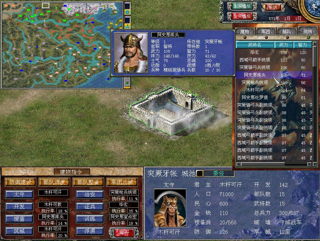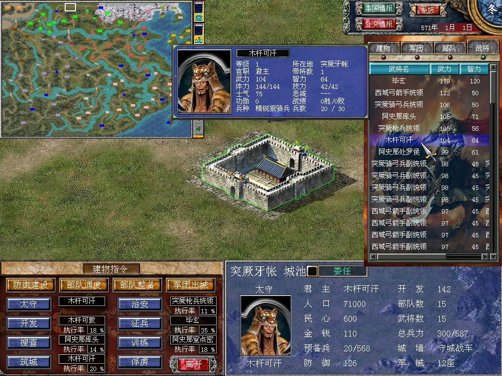 正主木杆可汗的武力值,比阿史那库头只低了1点,同样也是默认携带精锐狼骑兵的。以上提到的这三个有自己专属名字的角色,外加弓箭手、弓骑兵和枪兵统领,构成了突厥的100点以上武力值的头部梯队。主力全部集中在突厥牙帐,就看玩家自己怎么调兵遣将了。