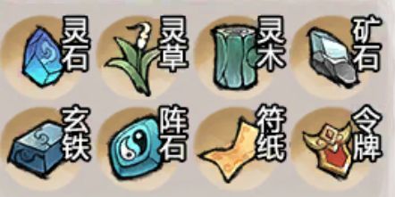 游戏内的资源分为:令牌、灵石、灵草、灵木、矿石、玄铁、符纸、阵石。其中前期最重要的是令牌(相当于体力)