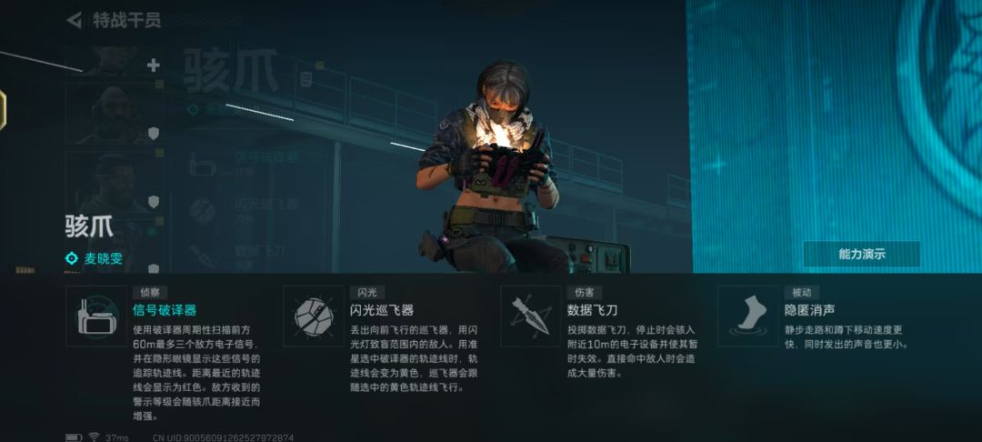 需要注意的是骇爪的闪光无人机是可以打掉的,骇爪被动则是会让你在蹲下时拥有比其他干员更快的移动速度。骇爪的大招是在开启大招之后会对前方60米的范围进行一个环境扫描,用扫描三次,且是立体的扫描形式,是可以跨楼层的扫描,如果是在摸金模式中扫描到的敌人在会在你的UI右下角显示出他的护甲等级