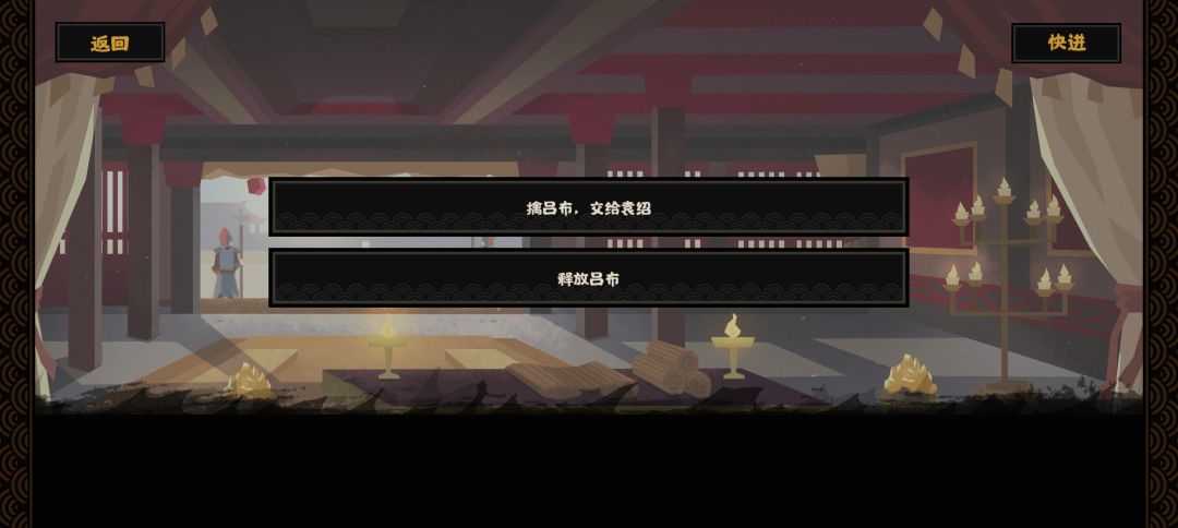 3飞将末路。一定要选择抓住吕布上交给袁绍。吕布灭亡,点两次苌弘技能