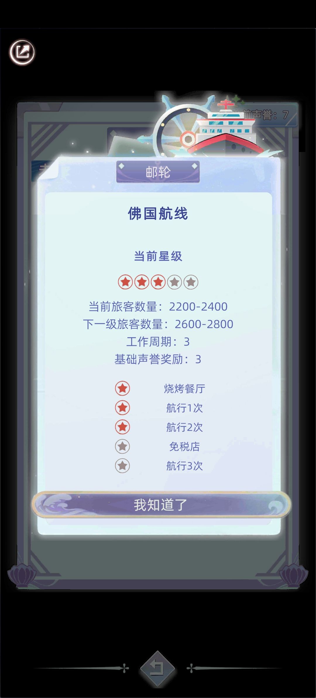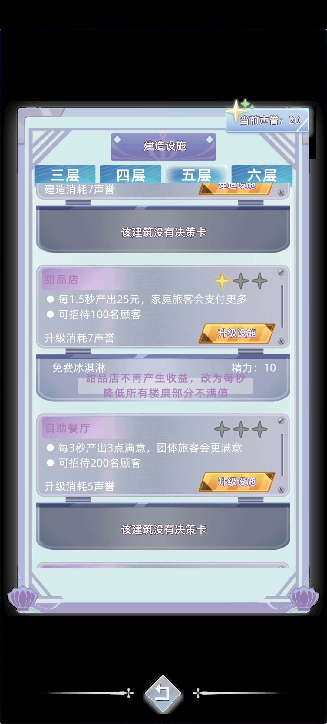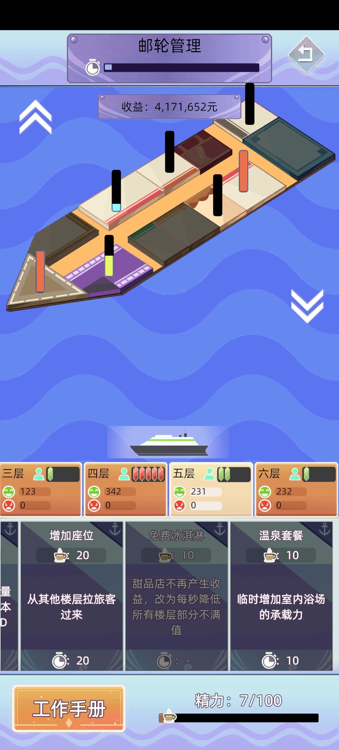 主要是第三阶段的船长,首先是航线,目前不能确定初始的几个航线的解锁条件,有以下几个猜测:①跟三层的几个建筑有关;②跟声誉有关(这个可能性比较大点,我自己也不太确定,因为我是刚当上船长就解锁了航线的);为避免刚当上船长就无航线可用的窘境,建议前期尽可能完成工作程度为优秀,多积攒点声誉,先别急着研发赠品,在建造设施中能开就先开三层的几个建筑。其次初期建议先开五层的甜品店,P6那个决策卡很好用,可以从一工作发挥效果到最后,建议进入工作模式就直接用。其次建议开的是四五六层的效果是『从其他楼层拉旅客过来』的决策卡设施,如四层的超市、五层的主餐厅、六层的泳池,随后可以先提升楼层的承载力,如五层的温泉餐厅、六层的浏览平台,之后选择性根据情况调整开决策卡设施的先后顺序(四层的海事部也还行,随机3张卡进入CD环节但+20精力,而且海事部那个每秒产出一点声誉的效果也挺好的)。