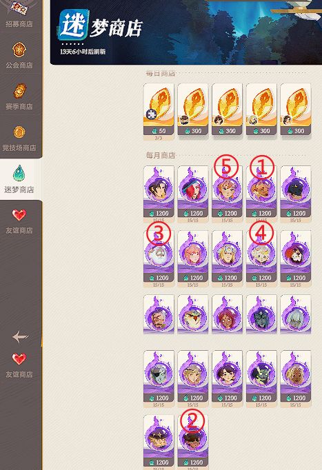 购买推荐:按图中数字①②③④⑤顺序依次将一个英雄培养到巅峰+后再培养下一个