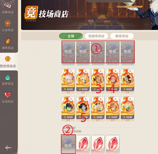 满足基本推图需求后,就攒竞技币购买星源水晶(图中的①②),这个需要竞技场段位达到一定程度才逐步解锁,刷新后必买。