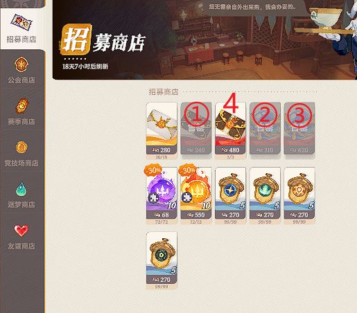 说明:游戏中星源水晶(即图中②③的道具,一般叫球或蓝球)是抽取神魔英雄的唯一道具,为了养成神魔英雄,我们要大量获取球。史诗招募券(即图中①4,一般叫红抽或史诗抽)抽卡概率较高,但比普通抽更难获得,所以打折的①我们必须买;4因为不打折,则货币充足的情况下可以买。
