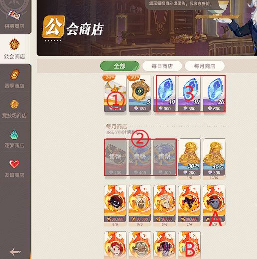 购买推荐:①②是刷新后必买。3则是需要紧急给英雄升级专武但是又没有足够的(150个)蓝瓜子时才购买,每天最多只有40个所以打算升级专武得提前几天就开始购买攒着了。公会币可购买神魔英雄,个人推荐先A蝎子养到巅峰,再B双子养到巅峰+,神魔英雄培养顺序查看我另外的一篇帖子,或者参考其他主播的攻略。
