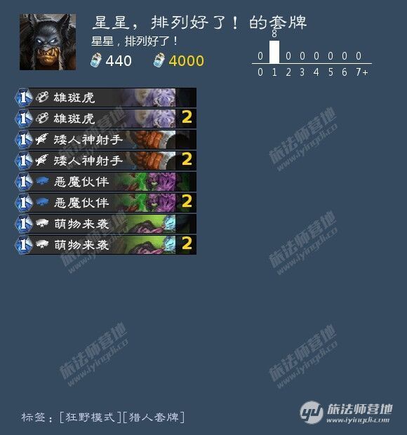 稳定站场体系选择8张1费牌,其中雄斑虎=鹿角小飞兔(飞刺警告),前6张牌均为非常扎实的站场,新卡萌物来袭可辅助站场,给的111可润滑节奏,也可配合杀戮命令,均不建议替换。