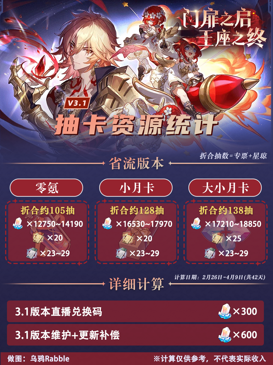 本期给大家带来的是星穹铁道3.1版本可获取的抽卡资源数量统计,让大家比较直观的看出不同档位下的可获取资源数量,方便自己做好卡池规划。