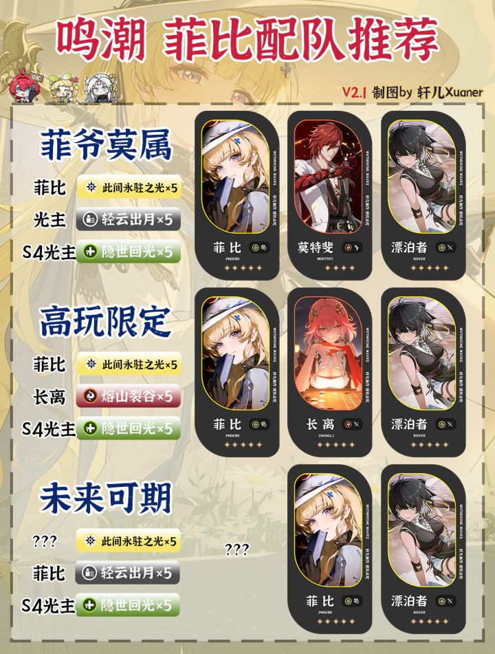 1/2、菲比+光主+守岸人/维里奈:如果你不想用光主做奶妈,而且还想用光主打出一定输出,那么就选择这套常规阵容,光主携带轻云出月五件套队伍伤害更高,如果你已经刷了两套光套,那不用轻云出月也无妨。