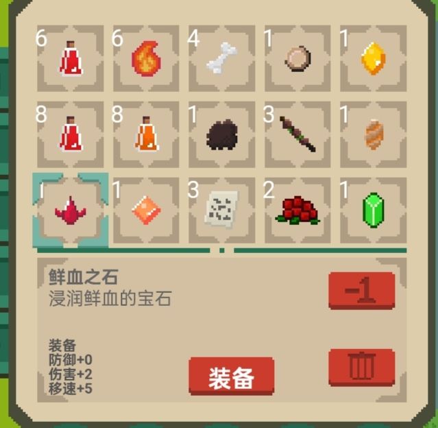 2.鲜血之石:防0伤2速5;蝙蝠小怪掉落;往移动方向冲刺并造成伤害;一般进地牢开第一个箱子(为了自然之力来激活主岛的树王boos)前就可掉落,是第一个boos前的入门装备