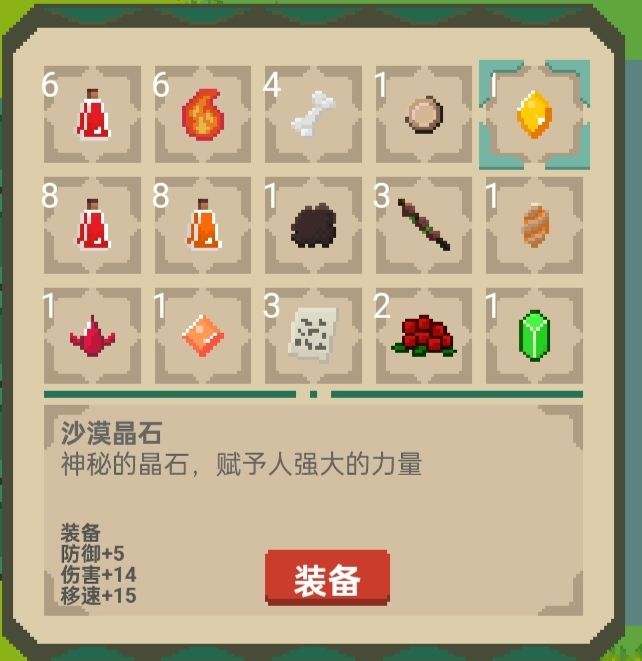 6.沙漠晶石:防5伤14速15;沙漠boos掉落;类似于流沙晶石,有前摇,向移动方向释放连续的沙雾攻击;第三个装备 7.烈焰晶石:防10攻18速15;火山boos掉落;向移动方向挥出一道挺宽的焰波,带击退效果,可以造成多次伤害;第四个装备 8.空间晶石:防10攻22速15;天空岛(神秘岛坐传送阵)boos掉落;对一定范围内的任何单位造成一次空间斩击,范围伤害,单位越多造成伤害次数越多,两个扎堆一般能秒;第五个装备(目前毕业)