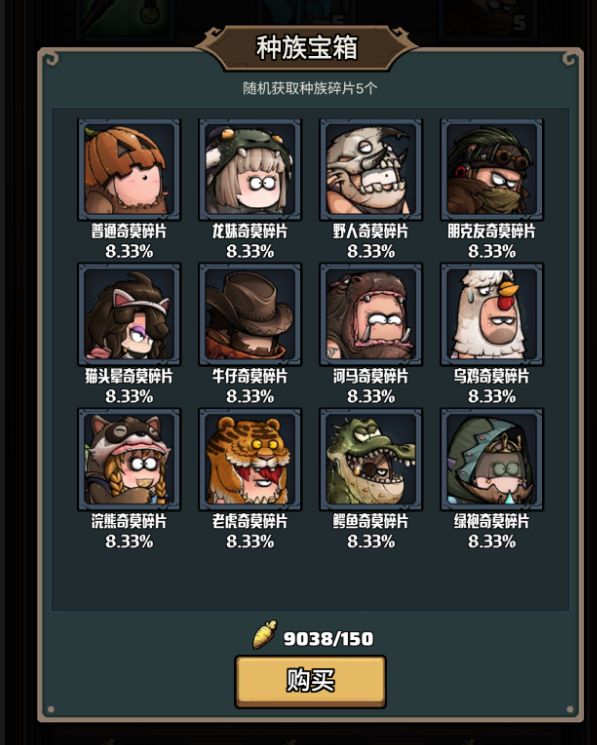 (2)游戏商店开种族宝箱。不论是直接购买碎片,还是开种族宝箱,只能获得下图12种角色碎片。