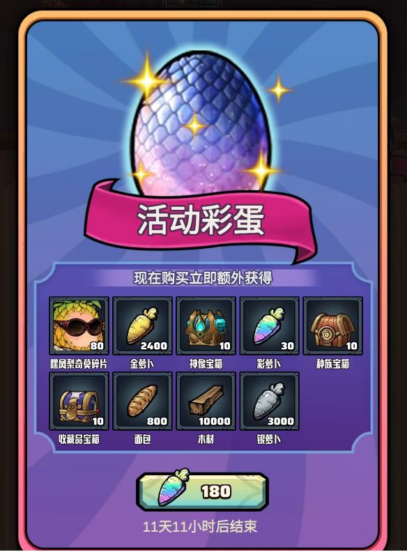 (5)活动获取,每期活动可以免费获取80活动角色碎片。如果想氪的话,可以花180彩萝卜(活动彩蛋奖励30,实际为150)再买80碎片。