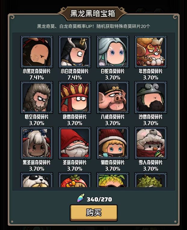 (4)史诗商店开宝箱。如果手头宽裕,想氪点解锁角色,可以开这个限时宝箱。宝箱里能开出除了普通种族宝箱外的所有奇莫碎片。