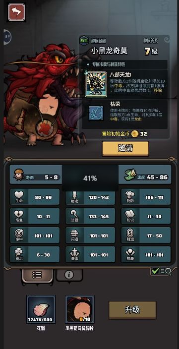 种族等级达到11、21时会升级专属卡牌的星级。种族等级越高招募时的基础属性就越好,招募时自带的金币就越多。下面放1张40级角色和7级角色的对比。可以看出,招募时满级角色的下限远远高出低级角色。像法师这种对法力有要求的职业,等级高的角色法力上限明显优于等级低的角色(黑化角色满级法力上限比其它角色高1点)。