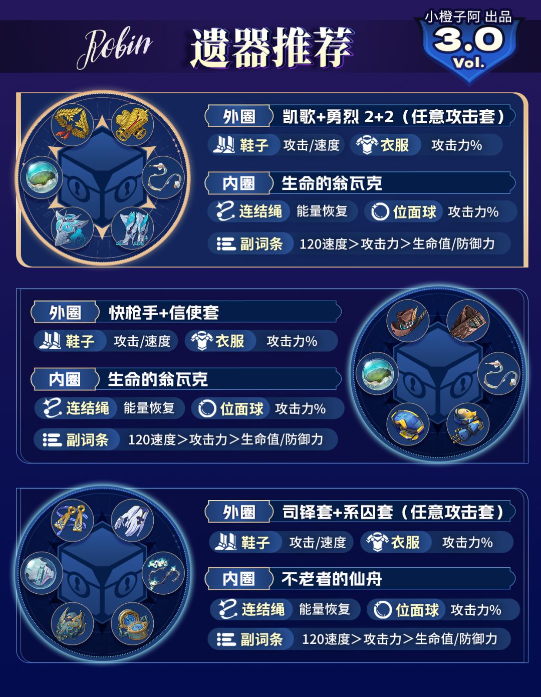 ① 知更鸟只需要堆攻击力即可,完全可选择【攻击力加成】的散件搭配,也可加入【信使套】更好地满足【翁瓦克】速度要求。