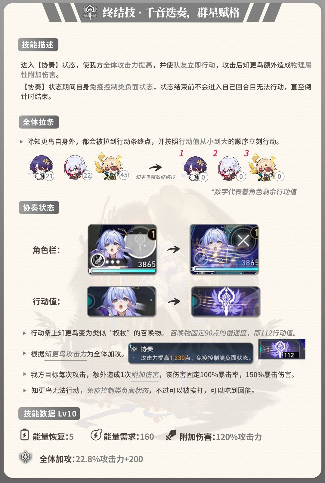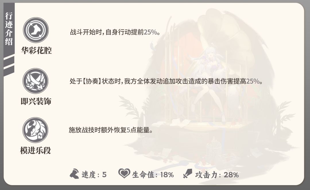 知更鸟在【协奏】状态下,群体拉条,全体加攻,自身替换为一个固定90点速度,初始行动为112的召唤物,当召唤物到达行动轴顶点时,知更鸟退出【协奏】状态并立即行动。进入【协奏】状态,开启“个人演唱会”,期间战斗BGM都会被知更鸟的歌曲覆盖。