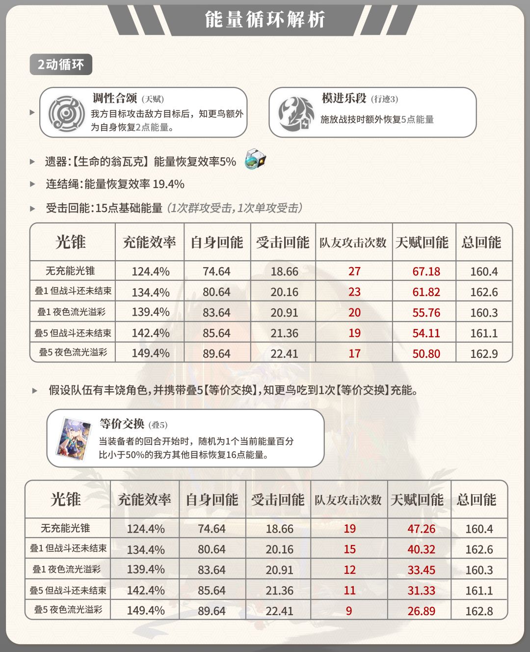 ● 在无充能光锥的条件下,需要队友攻击27次才可完成循环,受击次数有点难以达到,在这种条件下,建议三动循环,或者生存位配【等价交换】加拉赫,或者配藿藿以此降低充能压力。