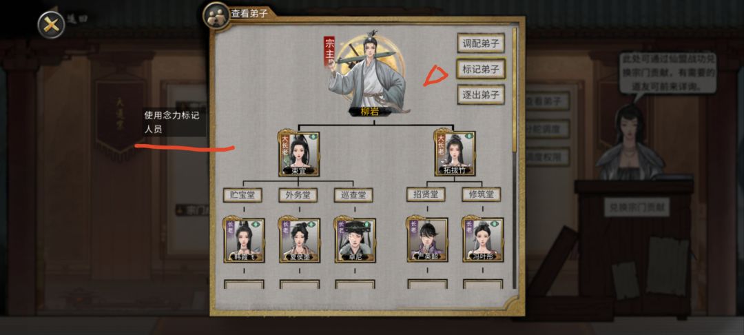 此外,在宗门议事大厅,查看弟子选项里,可以标记弟子,在前期我们念力比较少时,可以把我们亲近的一些人拉进宗门,利用这个功能随时找到他们