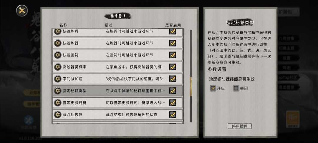 开了指定功法类型的插件,会影响藏经阁刷新的功法