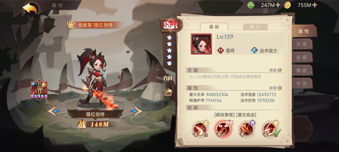 (2) 缺点:氪佬的玩具,但也仅仅只是玩具;如果暴击不了的话就是纯废物,后期的怪免暴很高,暴击不出来。所以剑圣虐菜很强,但攻坚能力弱,很难过前排。