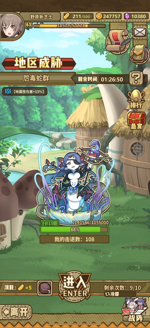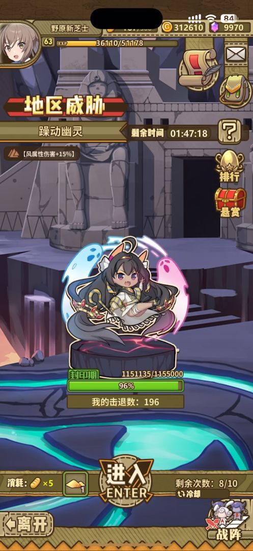BOSS分为4个时期,封印期,威胁期,狂暴期,追击期,共有10次挑战机会,每次挑战消耗5体力🍞+1种对应材料,限时1分钟