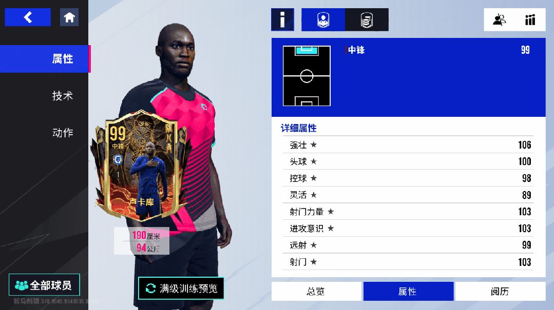 作为球队锋线的强力支柱,在进攻端的牵扯作用同样显著。【空霸】【高速带球】【爆发】【抗压】技术以及出色的身体素质,配合100的头球和104的速度属性,让他既能在禁区内利用头球优势抢点破门,也能凭借高速带球突破防线,为球队创造得分机会。