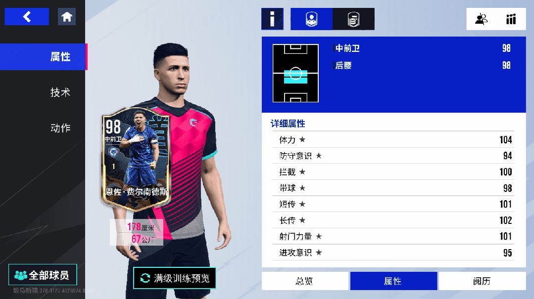 作为球队中场的核心人物,在防守端同样表现出色。【拦截】【孜孜不倦】【抗压】技术以及104的体力和100的拦截属性,让他在中场积极拼抢,为球队筑起一道坚固的屏障,在高强度的对抗中也能稳定发挥,掌控比赛节奏。