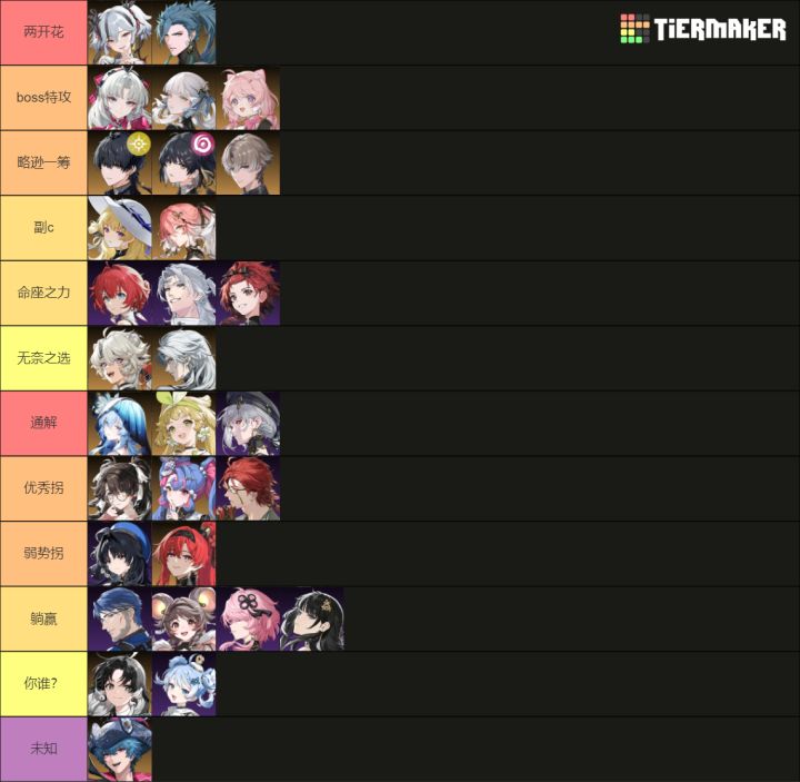 4.角色有多个用途时,按一般用法讨论。在特殊情况可能不适用——比如菲比告解形态在2.3版本能当光躁辅;比如九千防御桃祈大世界主c玩法。等。