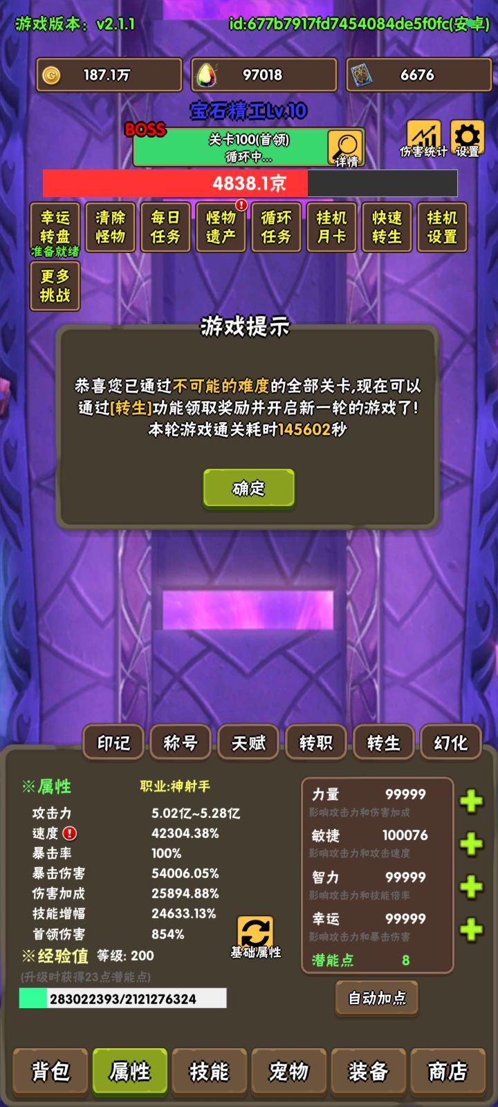 然后记得宠物攻击4亿 人物5亿 然后放置刷关(其实如今回想这是错误的,应该继续刷钱和宠物攻击)