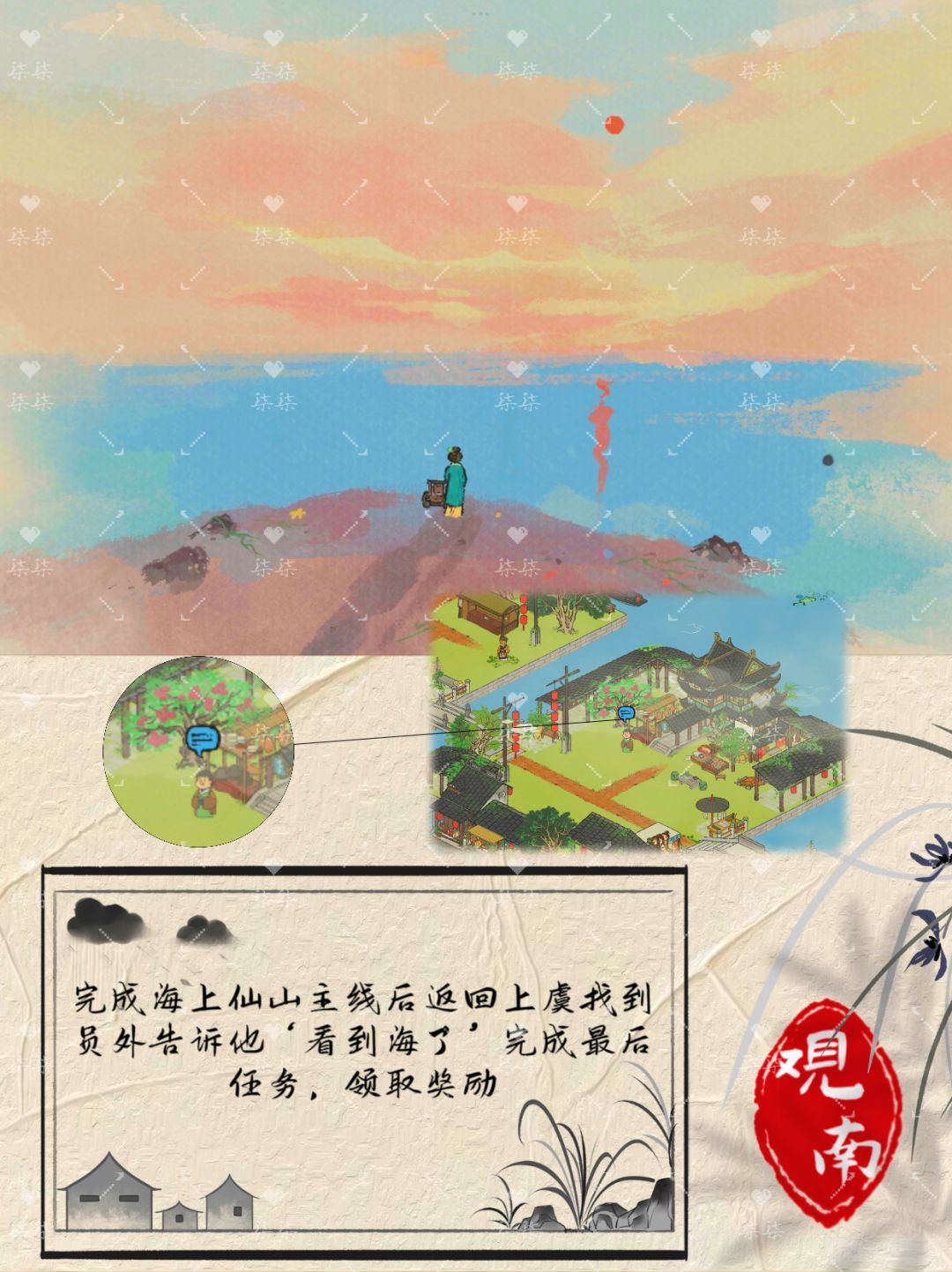 - 上虞任务:完成海上仙山主线任务后,回到上虞探险,找到员外,跟他说 “看到海了”,就能领奖励,完成上虞的最后任务啦。图四小图上传错了,在图二十二补充上了