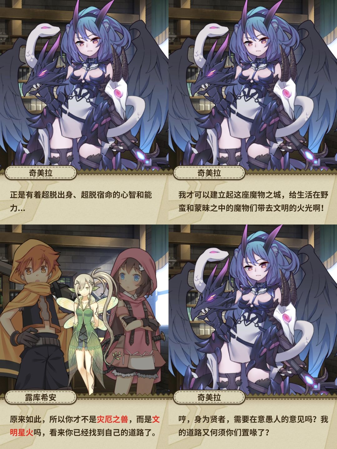 终于见到了传说中的城主,那就是文明星火·奇美拉,老师也介绍了奇美拉的来历,原来曾经是魔族制造的最终决战兵器,某位跟主角帕克同名的帕克(蜘蛛侠的叔叔)说过“能力越大,责任越大”,奇美拉不仅没有发起战争,反倒是运用自己的能力,建立起了这座魔物之城,给魔物带来了文明,走出了一条自己的路,不愧是<文明星火>。