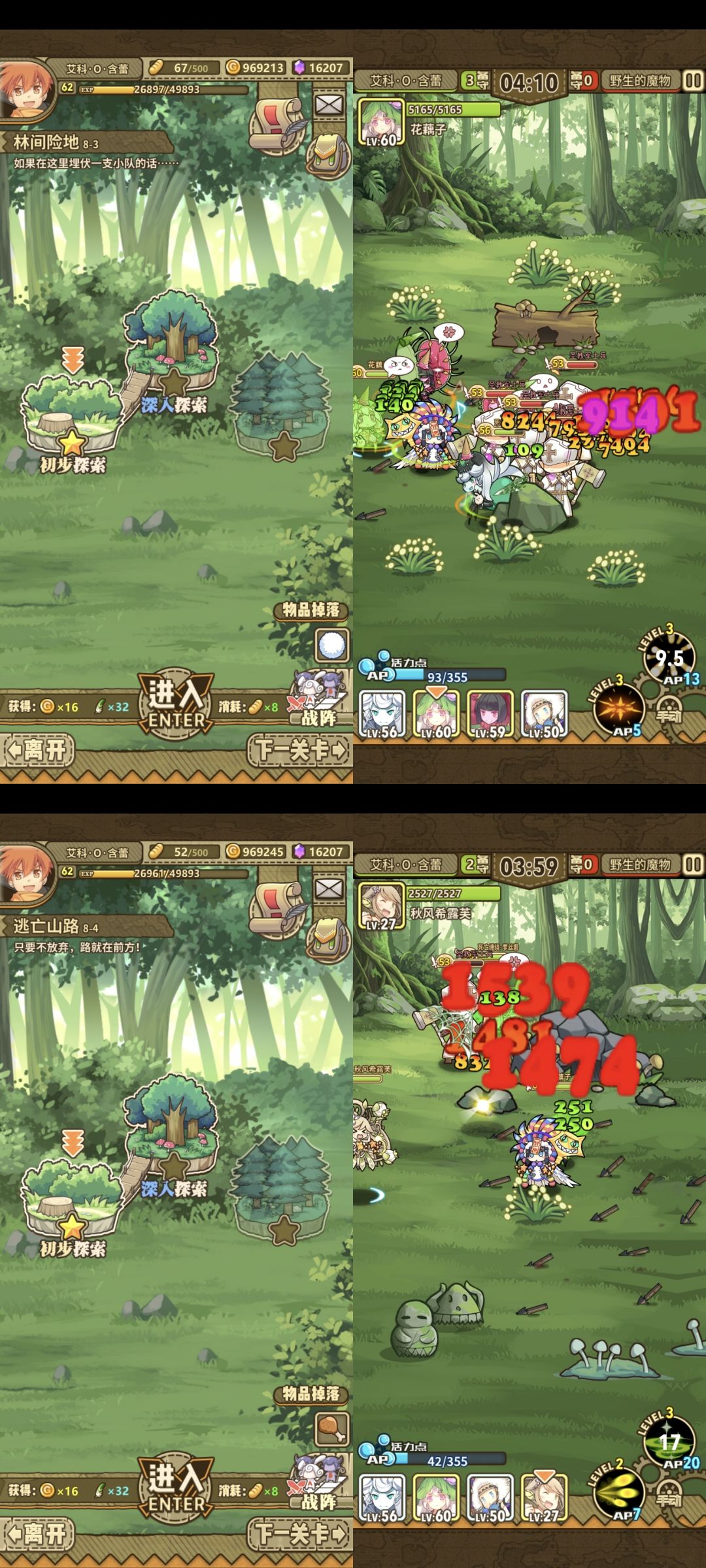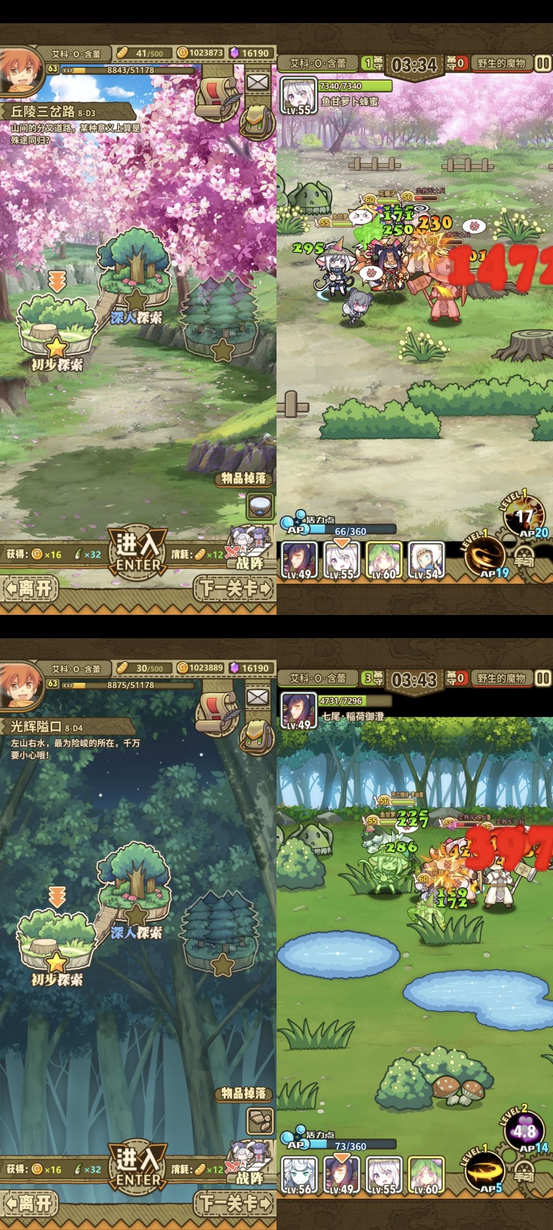 后面这些关卡就没什么难度了,都是怪堆,七尾这里发挥很好,就是输出打得太慢了,关底是8-D6两条命的天界石头人,但是打起来没有8-A2吃力,没费什么劲就过了,八图结束。