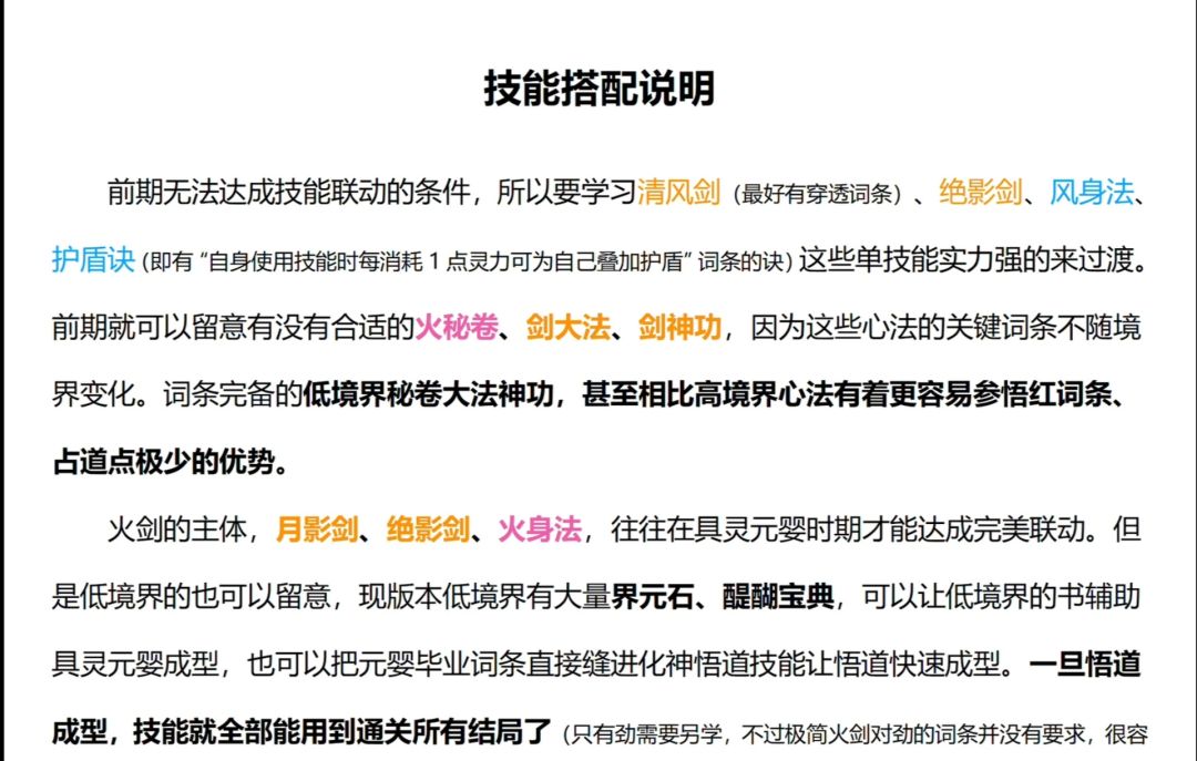 火剑的主体月影剑、绝影剑、火身法,通常在具灵元婴时期才能完美联动。不过低境界时也可留意,当前版本低境界有大量界元石、醍醐宝典,可让低境界的书辅助具灵元婴成型,也能把元婴毕业词条直接缝进化神悟道技能,促使悟道快速成型。一旦悟道成型,技能全部可用于通关所有结局(只有劲需要另学,不过极简火剑对劲的词条无要求,很容易学)。