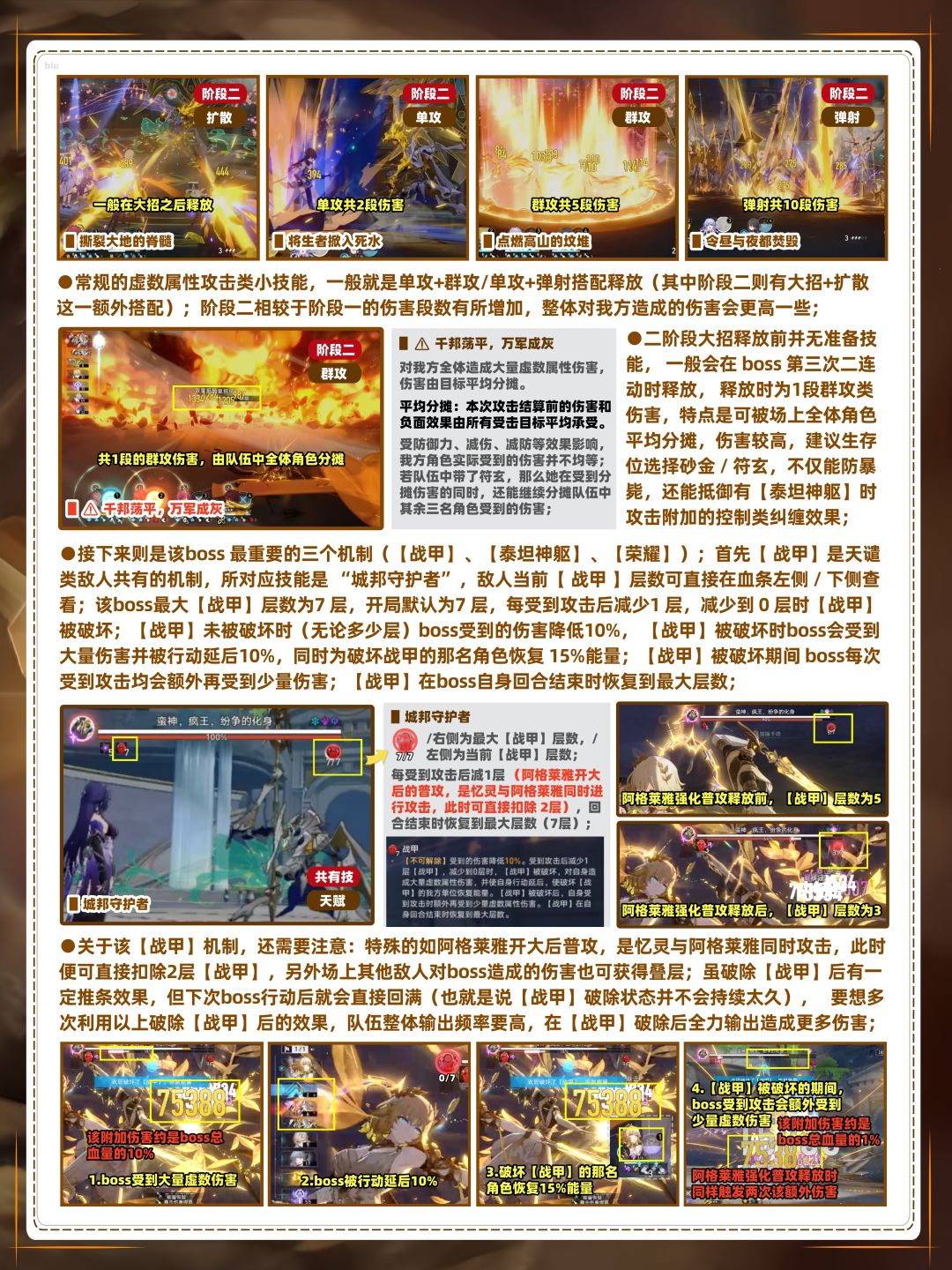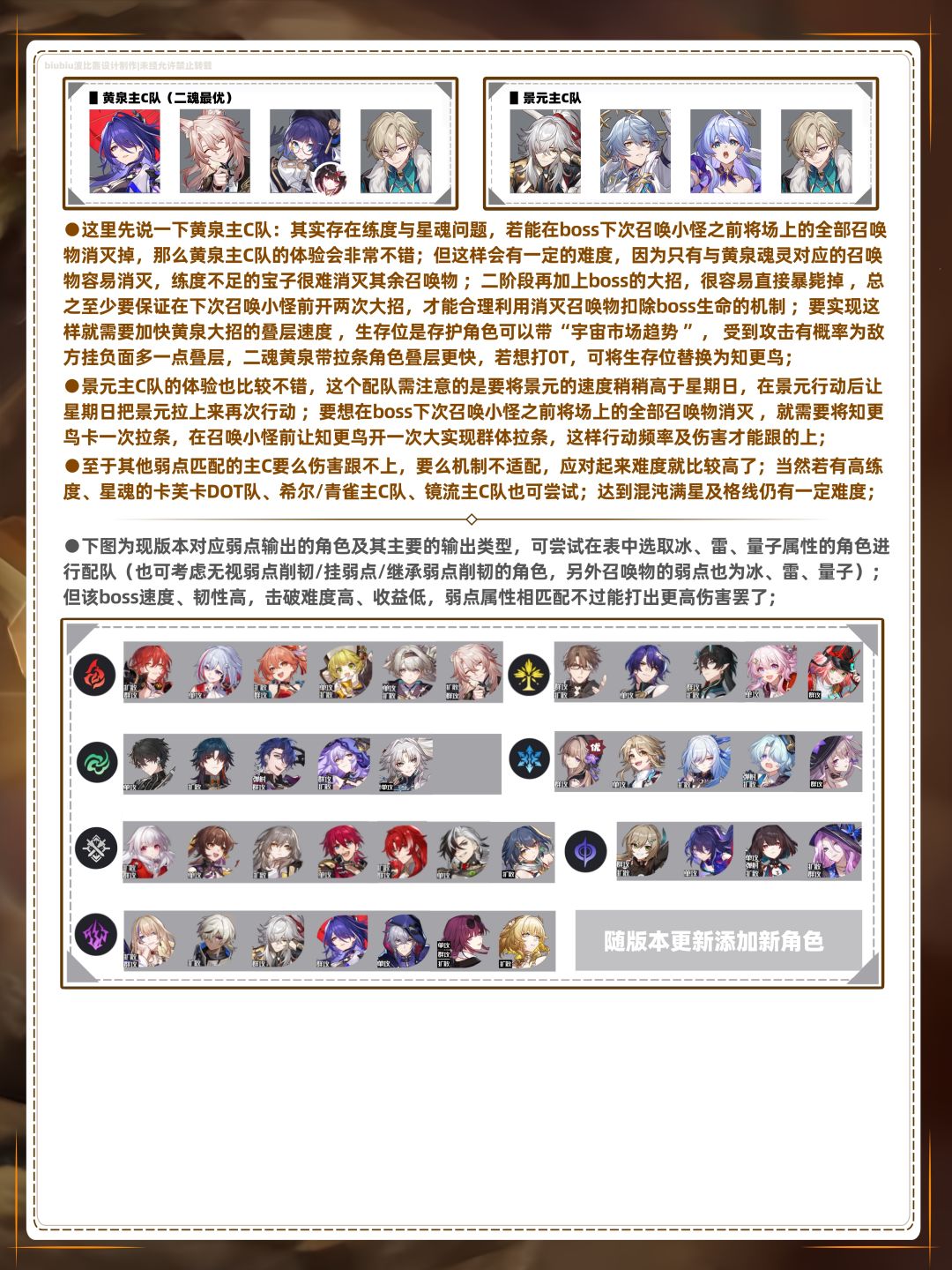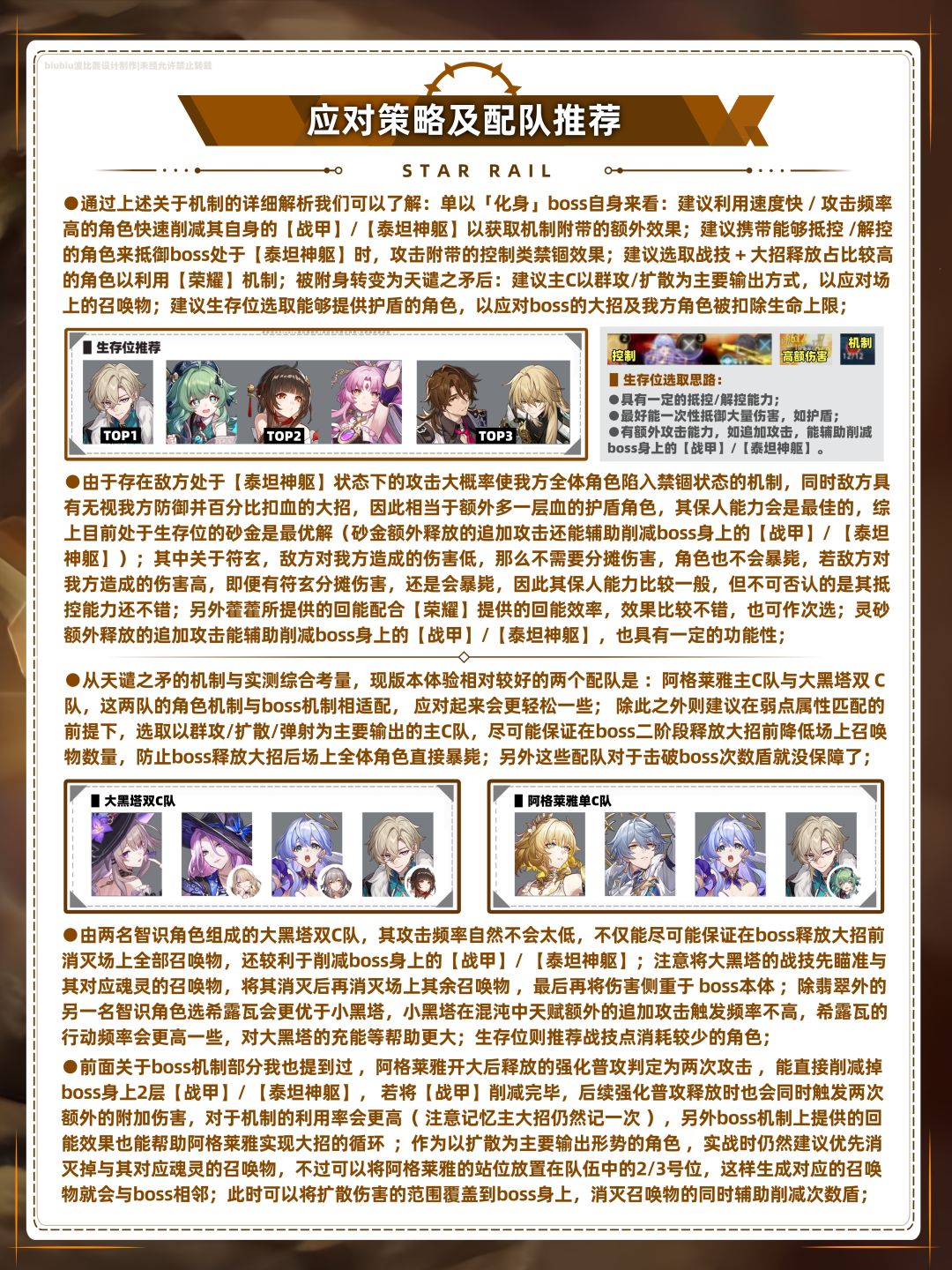 总的来说,主C/副C要选择攻击频率高的群攻/扩散/弹射角色,保证消灭召唤物的同时尽可能削弱boss的次数盾;辅助建议选择拉条角色进一步加快队伍的攻击频率;生存位则需考虑解控、抗伤、额外攻击这几个方面即可;两个高光配队是大黑塔双C队与阿格莱雅单C队,机制上与boss的适配性会更高一些,平民玩家则可以考虑练一下记忆主,利用大黑塔+希露瓦+记忆主+加拉赫的低金配队就能满星混沌回忆;机制上对于老角色并不友好,相信后期会出一些更容易应对该boss的新角色;