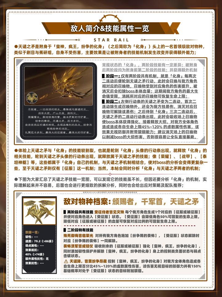 天谴之矛与剧目和蕉研组类似,观感上是附身于其余敌对物种头上的一种boss,只是相较于前两者,天谴之矛附身的对象本就是一名boss级敌对物种,总体机制会更加复杂,不仅需分析原boss自身的机制,还需分析附身后新增的机制;由于存在消灭召唤物扣除boss血量的机制,因此较适配于群攻角色;