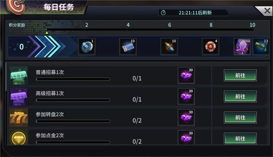 各位探长可通过在边城警视厅完成不同颜色次数任务来领取档位奖励。子弹可用于刷新任务,警徽可用于重置任务。不同任务对英雄的阵营,品级和星级均有不同要求。任务可进行锁定,被锁定的任务不能手动刷新,但每隔24小时会自动刷新。