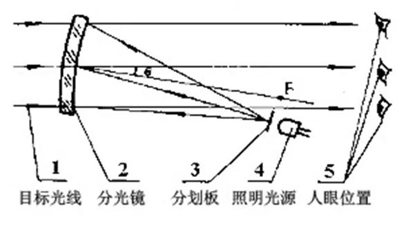 其原理可以简述为:析光镜的凹面上镀有一层或多层析光膜,由照明系统发出的光线通过分划板然后在析光镜上形成标记并反射以平行光进入人眼,同时人眼透过析光镜看到目标,当瞄准标记与目标重叠时,即完成瞄准。